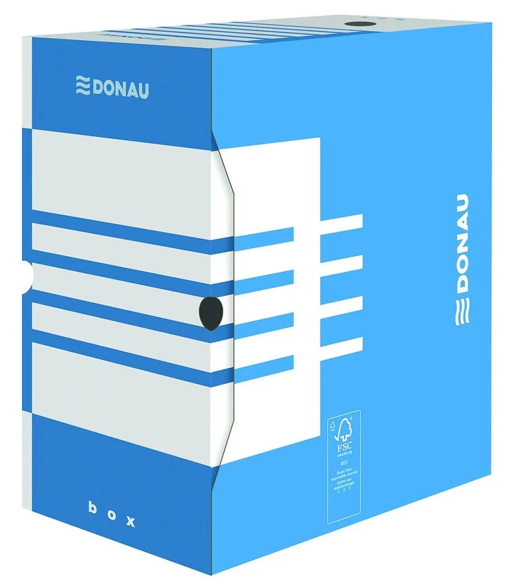 wykonane z trójwarstwowej tektury falistej o gramaturze 390gsmprodukt bezkwasowy (pH ok. 7,5) typ fali: B szerokość grzbietu: 155mm pojemność: do 1550 kartek o gramaturze 80gsm mieści 2 segregatory A4/75mm, wysokość pudła dopasowana do wysokości segregatora posiada 5 otworów ułatwiających wkładanie/wyjmowanie oraz 5 ścian opisowych pasuje do wszystkich pudeł zbiorczych Donau możliwość stawiania na krótszym lub dłuższym boku posiada certyfikat FSC format: A4 wymiary: 155x340x297mm kolor niebieski