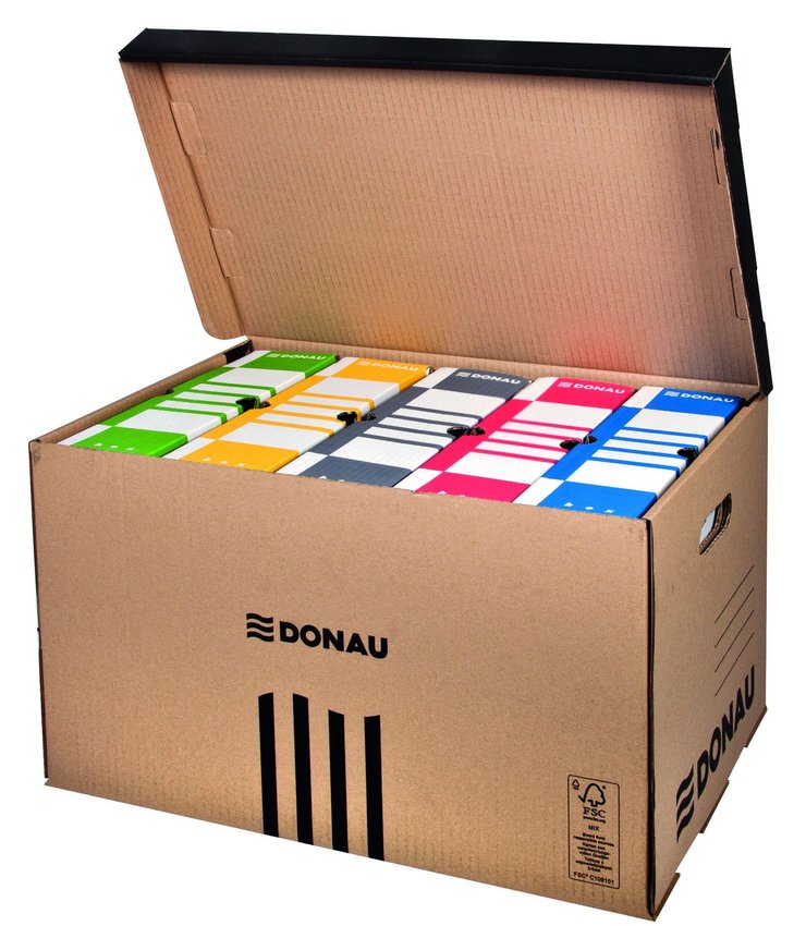 wykonane z trójwarstwowej tektury falistej o gramaturze 450gsmprodukt bezkwasowy, wskaźnik pH ok. 7,5 typ fali: C mieści np. 6 pudełek 80mm lub 5 pudełek 100mm lub 4 pudełka 120mm lub 2 pudełka 155mm+1 pudełko 200mm lub 2 pudełka 200mm + 1 pudełko 100mm wzmocnione dno i uchwyty pozwalają przenosić nawet najbardziej dociążone segregatorami/pojemnikami pudło zintegrowana klapa otwierana od góry ułatwia dostęp do dokumentów bez konieczności wyjmowania pudełek z pudła zbiorczego kompatybilne z pudłem wzmocnionym otwieranym z przodu - specjalne otwory w dnie i wypustki w klapie ułatwiają składowanie pudeł piętrowo składane, proste w montażu posiada certyfikat FSC, który gwarantuje, że papier pochodzi z ekologicznie zarządzanych obszarów leśnych udźwig do 26kg wymiary zewnętrzne: 558x370x315mm (± 5mm) kolor brązowy