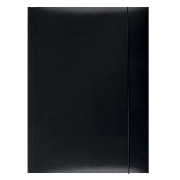 teczka z gumką, wykonana z kartonu o gramaturze 350gsm3-skrzydłowa, lakierowana zamykana za pomocą gumki wzdłuż dłuższego boku format: A4 rozmiar: 232x320mm kolor czarny