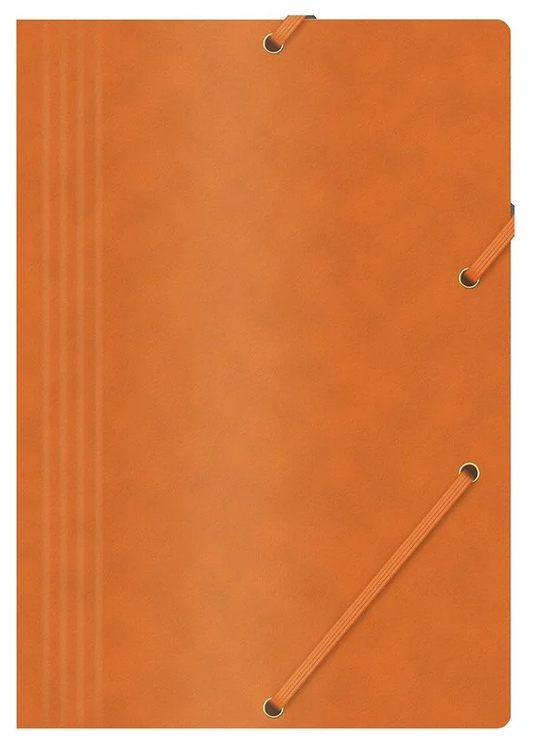 wykonana z kartonu typu preszpan o gramaturze 390gsm, powlekanego woskiem3-skrzydłowa zamykana za pomocą 2 płaskich, narożnych gumek w kolorze teczki format: A4 rozmiar: 233x318mm kolor pomarańczowy