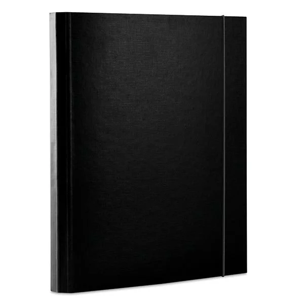 teczka poszerzana, 3-skrzydłowawykonana z utwardzanego kartonu (grubość 2mm) pokryta ekologiczną folią PP wewnątrz biała okleina pojemność: ok. 280 kartek o gramaturze 80gsm zamykana, okrągłą gumką wzdłuż teczki szerokość grzbietu: 30mm format: A4 kolor: czarny