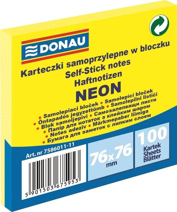 Bloczek Samoprzylepny Donau 76X76mm 1X100 Kart. Neon Żółty