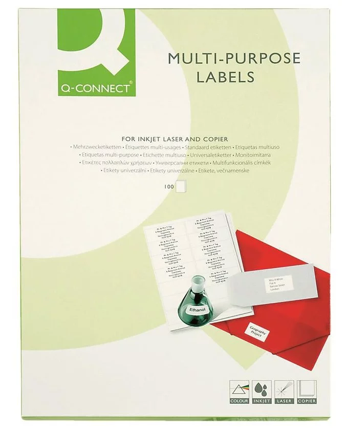 klasyczne etykiety samoprzylepne, odpowiednie do drukarek laserowych, atramentowych i kserokopiarekrozmiar etykiety: 38,1x21,2mm liczba etykiet na arkuszu: 65 gramatura: front 70gsm, podkład 55gsm białość: 150 CIE QCT - Quatro Clean Technology - ochronne pole wzdłuż krawędzi etykiety, które zapobiega odkładaniu się kleju na mechanizmie drukarki na tylnej stronie opakowania widok 1:1 rozkładu etykiet na arkuszu możliwość pobrania darmowego programu do projektowania i wydruku etykiet Q-CONNECT SOFT kompatybilny również z oprogramowaniem Windows 7 dostępny na Q-CONNECT.com lub pbspolska.eu 100 arkuszy w j.s. kolor biały
