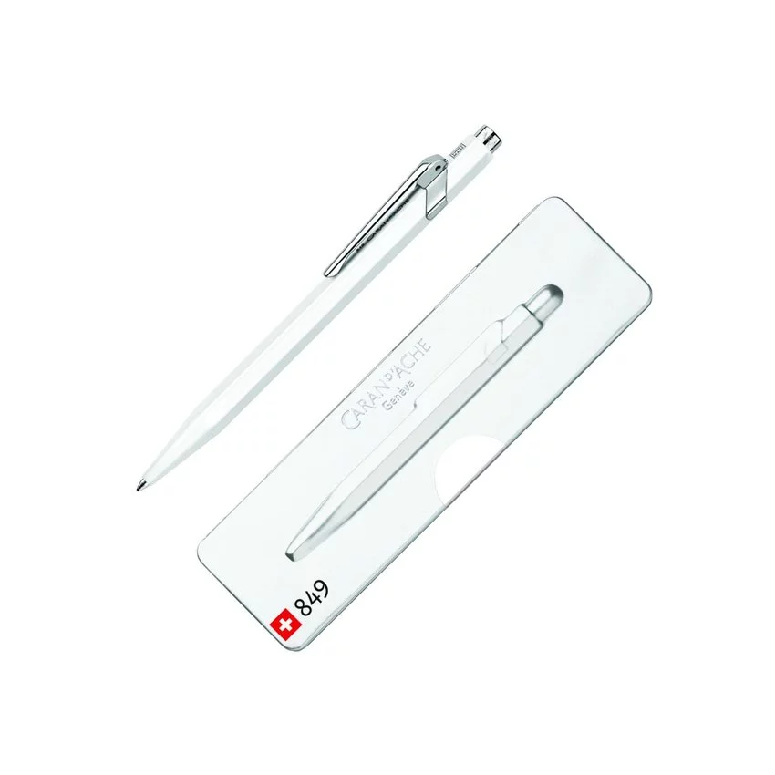 modny, kultowy i ponadczasowydługopis 849 to wizytówka marki Caran d’Ache długopis wykonany z aluminium o sześciokątnym przekroju, idealnie dopasowany do dłoni pokryty metodą malowania proszkowego posiada przyciskowy mechanizm wysuwu wkładu i bardzo solidny klips wyposażony w bardzo pojemny wkład długopisowy Goliath, który pozwoli nam na zapisanie 600 stron A4 do długopisu dołączone jest wyjątkowe, aluminiowe opakowanie wyprodukowany w Szwajcarii kolor: biały
