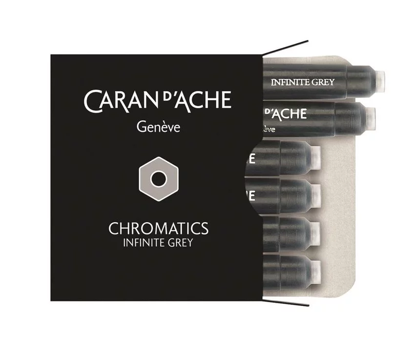 naboje atramentowe szwajcarskiej marki Caran d’Ache z kolekcji Chromaticscharakteryzują się niezwykle intensywnym pigmentem, który nadaje im charakter i styl naboje umieszczone są w eleganckim, firmowym kartoniku w zestawie znajduje się 6 nabojów kolor: szary