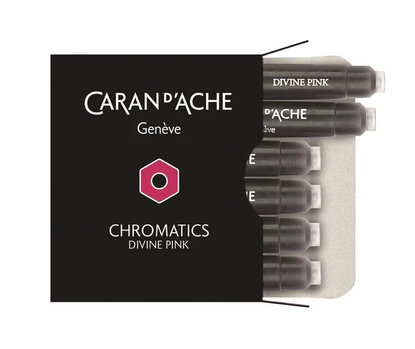 naboje atramentowe szwajcarskiej marki Caran d’Ache z kolekcji Chromaticscharakteryzują się niezwykle intensywnym pigmentem, który nadaje im charakter i styl naboje umieszczone są w eleganckim, firmowym kartoniku w zestawie znajduje się 6 nabojów kolor: różowy
