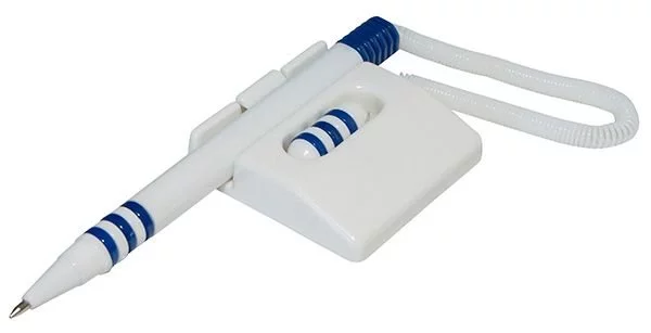 długopis na sprężyncededykowany punktom publicznym, takim jak: urzędy, punkty pocztowe, recepcje i sekretariaty, etc. długopis utrzymywany w pozycji poziomej sprężynka odporna na odkształcenia nowoczesny design stabilna podstawa przyklejana do powierzchni biurka kolor: niebiesko-biały