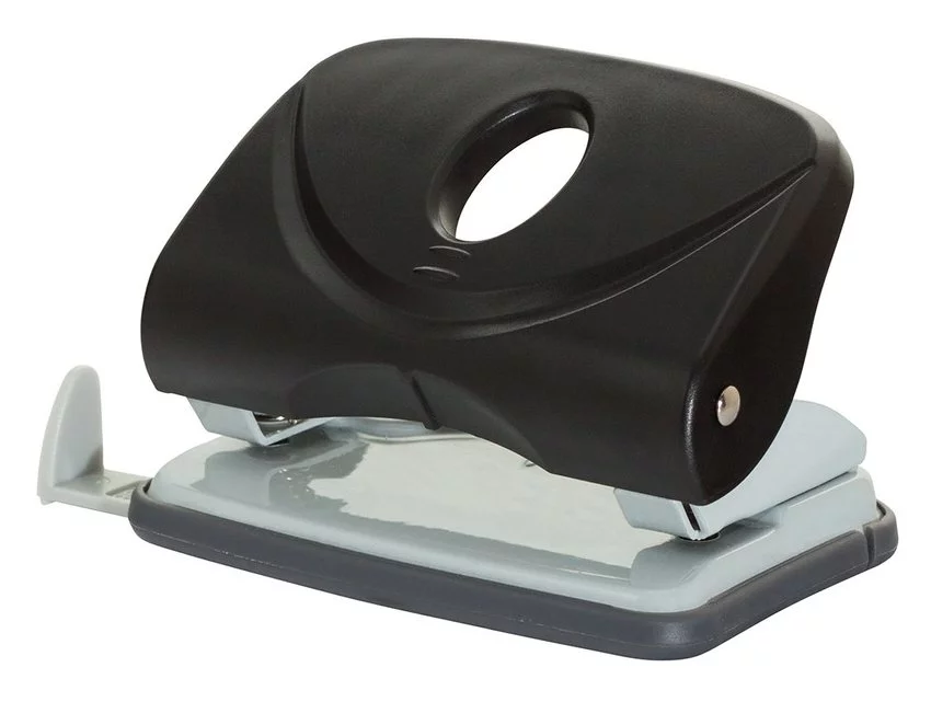 dziurkacz do 20 kartekmechanizm i podstawa metalowe, plastikowe ramię (ABS) głębokość wsuwania kartek: 12mm odstęp pomiędzy dziurkami: 80mm średnica dziurki: 5,5mm ogranicznik formatu: Q1, US-Quart, 888, Folio, A4, A3-E, A5, A6, B5, B6, Ex antypoślizgowa plastikowa nakładka na podstawę wskaźnik środka strony posiada blokadę ramienia w postaci wyjmowanego plastikowego ogranicznika na dziurkaczu nadrukowana nazwa marki pakowany po 1szt. w katonowe pudełko gwarancja 5 lat kolor: czarny