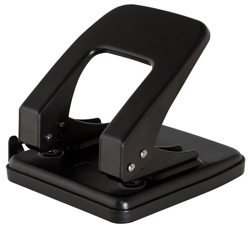 dziurkacz do 40 kartekmechanizm i obudowa metalowe głębokość wsuwania kartek: 12mm odstęp pomiędzy dziurkami: 80mm średnica dziurki: 5,5mm ogranicznik formatu: Q1, US-Quart, 888, Folio, A4, A3-E, A5, A6, B5, B6, Ex antypoślizgowa plastikowa nakładka na podstawę wskaźnik środka strony gwarancja 5 la posiada wbudowaną blokadę ramienia na dziurkaczu nadrukowana nazwa marki pakowany po 1szt. w katonowe pudełko kolor: czarny