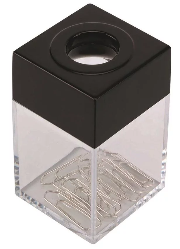 wykonany z plastikugórna czarna część z magnesem i okrągłym otworem do wyjmowania spinaczy dolna część - transparentna prostokątny wymiary: 40x40x70mm średnica otworu: 20mm kolor transparentny czarny 10 spinaczy GRATIS