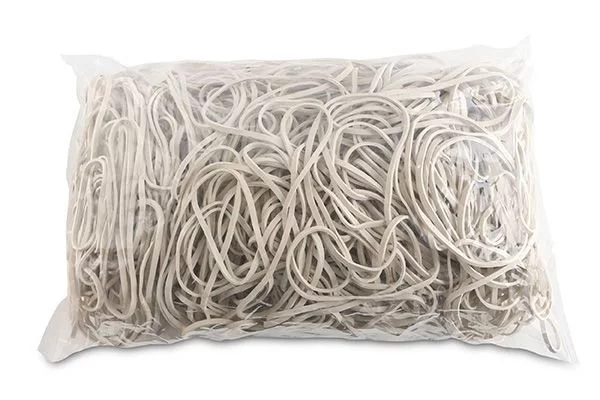 gumki recepturkiwytrzymałe i elastyczne wykonane z materiału o domieszce kauczuku (60%) średnica: 80mm grubość/szerokość: ok. 1,5x3mm waga opakowania: 1000g kolor: biały