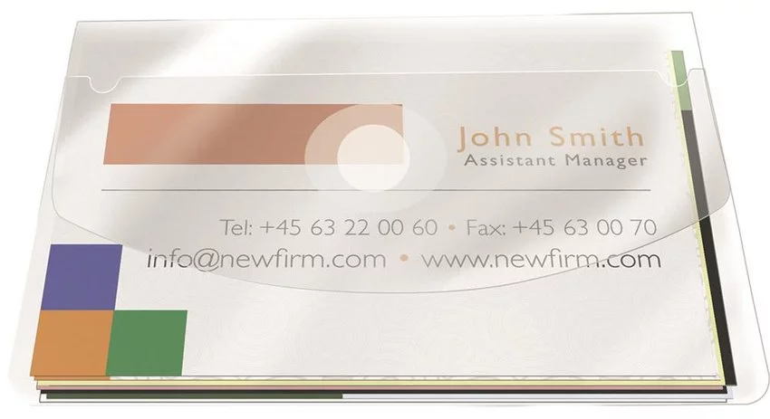samoprzylepna tylna stronaz klapką chroniącą wizytówkę przed wysunięciem wykonana z transparentnej folii PP (przód i tył: 120µm) folia bez zawartości kwasu – bezpieczna dla archiwizowanych dokumentów klej nie powoduje plam może być nalepiona na prawie każdą powierzchnię: papier, karton, plastik, itp. wymiar zewnętrzny: 105x60mm wymiar wewnętrzny: 101x58mm 10 sztuk w j.s. kolor transparentny