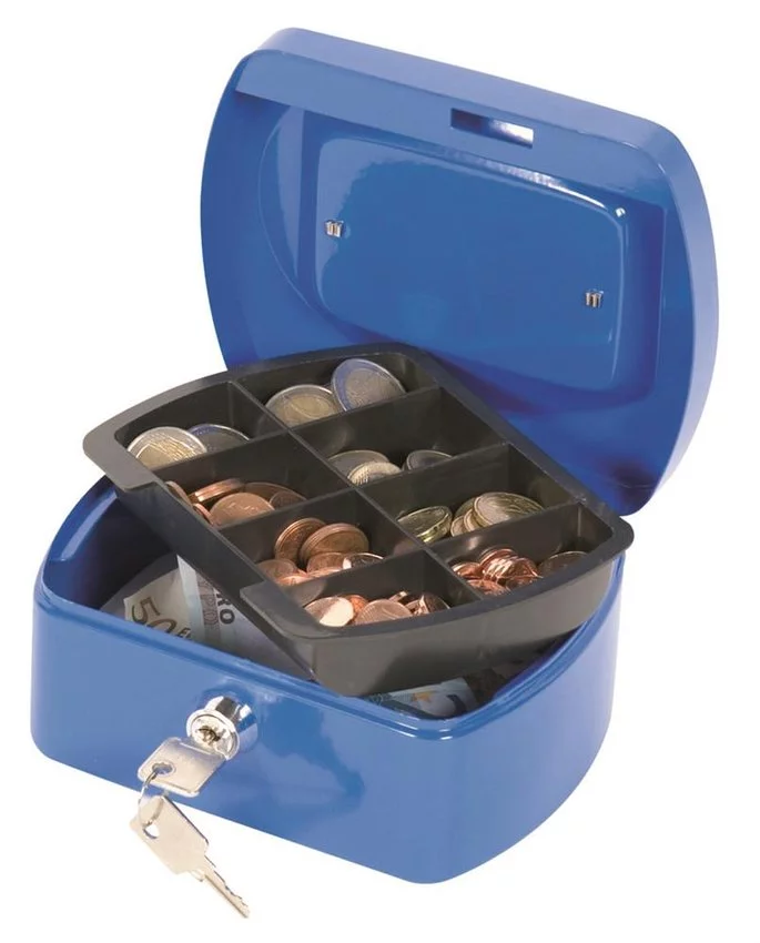mała kasetka na pieniądze wyprodukowana z lakierowanego proszkowo metalu odpornego na zarysowaniaposiada plastikową wkładkę umożliwiającą sortowanie pieniędzy na wieku uchwyt ułatwiający otwieranie i zamykanie zaokrąglony kształt zamykana na zamek (2 szt. kluczy w komplecie) wymiary: 155x75x120mm kolor niebieski