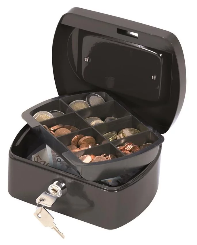 mała kasetka na pieniądze wyprodukowana z lakierowanego proszkowo metalu odpornego na zarysowaniaposiada plastikową wkładkę umożliwiającą sortowanie pieniędzy na wieku uchwyt ułatwiający otwieranie i zamykanie zaokrąglony kształt zamykana na zamek (2 szt. kluczy w komplecie) wymiary: 155x75x120mm kolor czarny