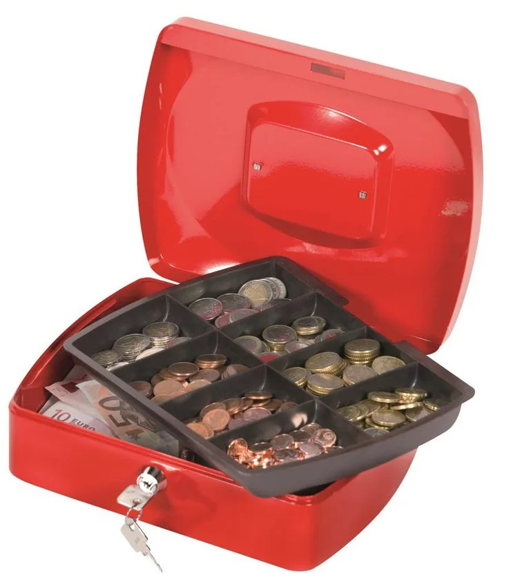 duża kasetka na pieniądze wyprodukowana z lakierowanego proszkowo metalu odpornego na zarysowaniaposiada plastikową wkładkę umożliwiającą sortowanie pieniędzy na wieku uchwyt ułatwiający otwieranie i zamykanie zaokrąglony kształt zamykana na zamek (2 szt. kluczy w komplecie) wymiary: 255x85x200mm kolor czerwony