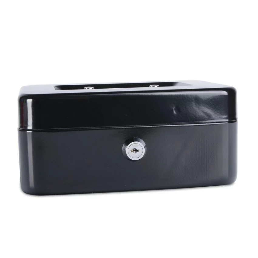 średnia kasetka na pieniądze wykonana z solidnego metalupowlekana lakierem oraz specjalną warstwą zabezpieczającą wyposażona w tackę na monety posiada rączkę ułatwiającą przenoszenie kasetki cechuje się zaokrąglonymi brzegami zamykana – 2 klucze w komplecie wymiary: 200x160x90mm kolor czarny