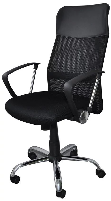 fotel biurowy z mechanizmem typu TILTmożliwość swobodnego kołysania oraz blokady pozycji do pracy regulacja wysokości siedziska w zakresie: 44-54 cm wysokość krzesła: 104-114 cm ergonomiczne oparcie ze zintegrowanym zagłówkiem wykonane z tkaniny membranowej i ekoskóry miękkie siedzisko plastikowo-metalowe podłokietniki stalowa podstawa rekomendowane maksymalne obciążenie: 100 kg szerokość siedziska: 47 cm (w najszerszym punkcie) głębokość siedziska: 49 cm (w najszerszym punkcie) szerokość oparcia: 47 cm (w najszerszym punkcie) wysokość oparcia: 63 cm (wysokość robocza) średnica podstawy: ok. 61 cm kolor: czarny