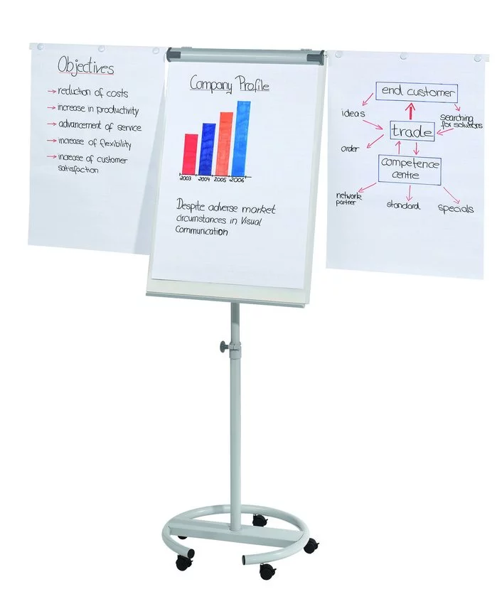- Flipchart mobilny Franken 68x110 cm z tablicą suchościeralno-magnetyczną i wyciąganymi ramionami, stworzony do intensywnej pracy biurowej i profesjonalnych prezentacji.