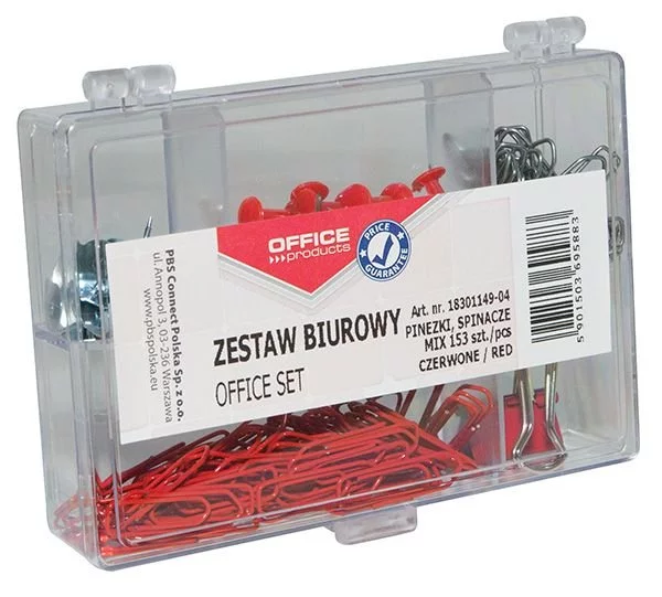 zestaw biurowy w praktycznym organizerzew skład zestawu wchodzi pinezka tablicowa (20 szt.), spinacz metalowy 26 mm (25 szt.), spinacz kolorowy 26 mm (70 szt.), pinezka metalowa (35 szt.), clip 19 mm (3 szt.) 153 szt. w j.s. kolor: czerwony