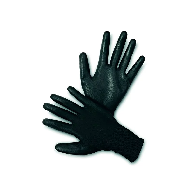 bezszwowe rękawice montażowe, zgodne z normą EN420wyściółka poliestrowa powlekane warstwą poliuretanu w części chwytnej dłoni elastyczny ściągacz w nadgarstku najwyższa dostępna odporność na przetarcie; odporność mechaniczna zgodnie z normą EN388: 4131 do prac: w magazynach, przy pracach montażowych w branży RTV i AGD, w branży motoryzacyjnej, w branży budowlanej kategoria: II rozmiar: 10 kolor czarny