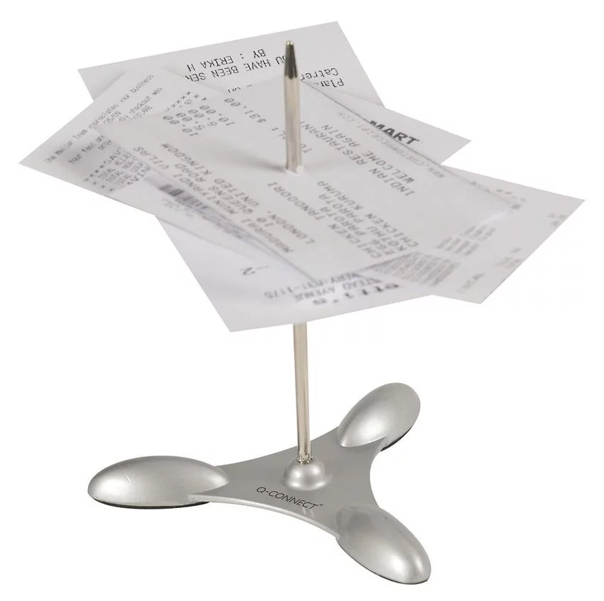 praktyczny metalowy nabijak do rachunków, karteczek, notatek, itp.do wykorzystania m.in. w punktach gastronomicznych, recepcjach, magazynach spód nabijaka gwintowany, wkręcany do stabilnej metalowej podstawy gumowe podkładki statywu zapewniają stabilność oraz chronią meble przed porysowaniem pomaga segregować rachunki, paragony, listy przewozowe, itp. długość: 110mm dostarczany rozłożony, w płaskim opakowaniu o wymiarach: 110x95x12mm, z zawieszką kolor srebrny