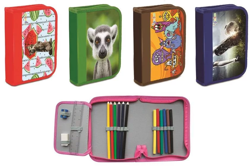 piórnik szkolny, nadruk z jednej strony, z wyposażeniem GIMBOO materiał PVC, zamek błyskawiczny posiada jedną komorę i jedną przekładkę z dodatkową kieszonką wymiary piórnika: 195x135x32mm kolor: mix kolorów, wzorów 15 elementów wyposażenia W skład wyposażenia wchodzą: kredki ołówkowe, sześciokątne, 6 kolorów flamastry plastikowe, 6 kolorów, tusz nietoksyczny, grubość 1,0mm temperówka plastikowa, pojedyncza (jedno ostrze) gumka kauczukowa, biała, 35x20x8mm linijka plastikowa, transparentna, 17cm