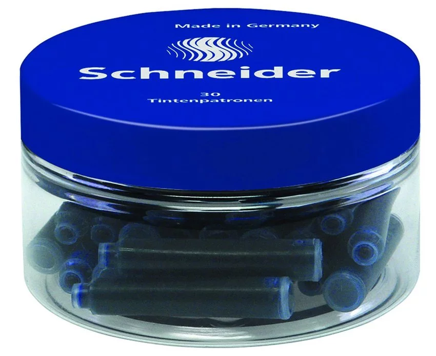klasyczne, uniwersalne naboje do piór (pasują także do piór wiecznych spoza oferty Schneider)wysokiej jakości atrament gwarantuje ciągłą linię pisania atrament w kolorze niebieskim - usuwalny kod kreskowy umieszczony na każdym produkcie słoik: 100 szt. kolor atramentu: niebieski