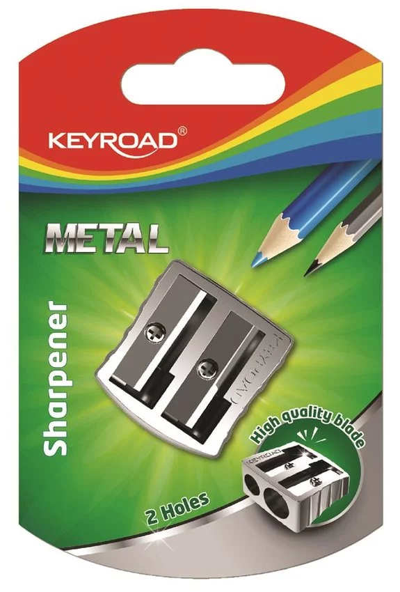temperówka wykonana z aluminiumwyposażona w dwa ostrza przeznaczona do ostrzenia ołówków i kredek o maksymalnej średnicy 8 lub 11mm nazwaKEYROAD wytłoczona na temperówce pakowana na blistrze kolor: srebrny
