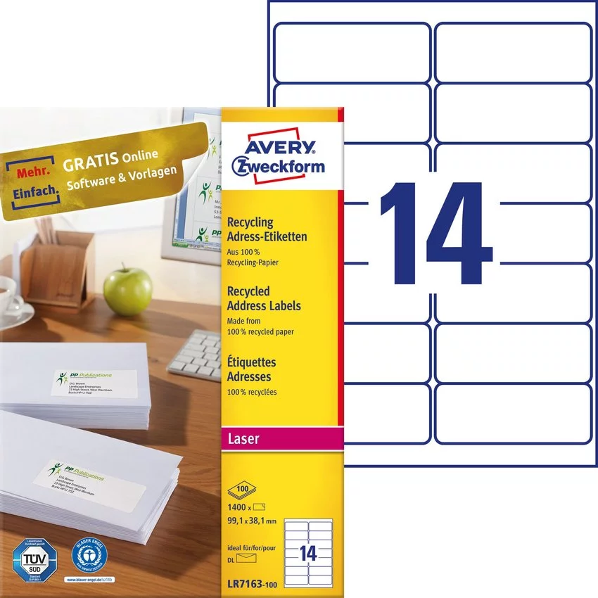 Naturalne białe etykiety adresowe LR7163-100 do drukarek laserowych w formacie 99,1x38,1 mm od AVERY ZWECKFORM są idealne do długich kopert DIN. Naklejki są wykonane w 100% z bezchlorowego papieru bielonego i posiadają certyfikat ekologiczny „Blue Angel”. Podczas produkcji nie występują emisje, a odpady produkcyjne są całkowicie poddawane recyklingowi. Możesz liczyć na całkowicie wolną od zacięć przepustkę drukarki bez osadzania się kleju w drukarce. Karta dostępu do drukarek laserowych przetestowana i potwierdzona przez TÜV SÜD. Szybkie i łatwe projektowanie i drukowanie etykiet adresowych dzięki bezpłatnym szablonom etykiet i rozwiązaniom programowym Avery Zweckform dostępnym na stronie www.avery-zweckform. eu / print lub szablony zintegrowane z pakietem Microsoft® Office. Łatwo obieraj i przyklejaj dzięki unikatowej pomocy Peeling-QuickPEEL ™. Nadaje się do wszystkich popularnych drukarek laserowych.