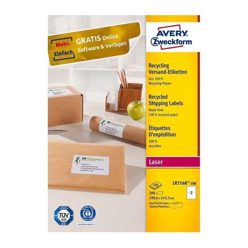 Naturalne białe etykiety adresowe LR7168-100 do drukarek laserowych w formacie 199,6 x 143,5 mm firmy AVERY ZWECKFORM są idealne do paczek i paczek. 200 naklejek na 100 kartkach. Składają się one w 100% z bezchlorowego bielonego makulatury i posiadają certyfikat ekologiczny „Blue Angel”. Podczas produkcji nie występują emisje, a odpady produkcyjne są całkowicie poddawane recyklingowi. Łatwa przepustka do drukarek laserowych przetestowana i potwierdzona przez TÜV SÜD.