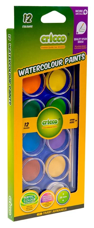 - Farby wodne Cricco 12 kolorów to praktyczny zestaw akwareli w dużych krążkach z nylonowym pędzlem – idealne do szkoły i kreatywnej zabawy.