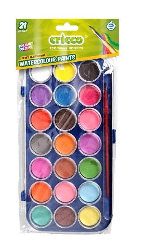 - Farby akwarelowe Cricco w kasetce to idealny wybór dla dzieci – 21 jasnych kolorów, łatwość mieszania i wygodny pędzelek czynią z zestawu świetne narzędzie do nauki i zabawy.