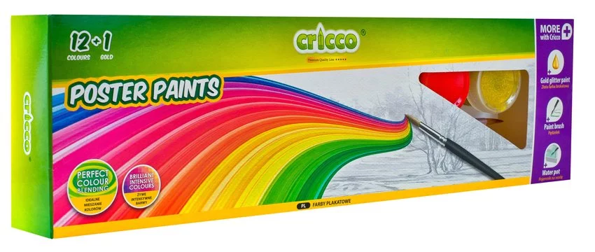 - Farby plakatowe Cricco to 12 intensywnych kolorów, złoty brokat i praktyczne dodatki, które sprawiają, że malowanie staje się prawdziwą przyjemnością – zarówno w domu, jak i w szkole.