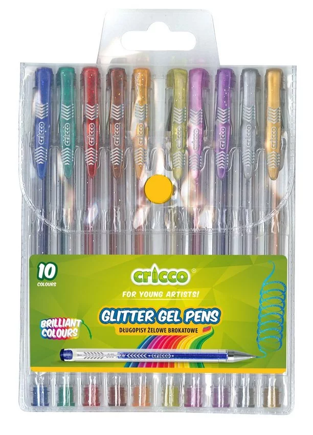 - Długopisy Żelowe Brokatowe Cricco 10 Kolorów w Etui – zestaw intensywnych, błyszczących kolorów z brokatowym efektem.