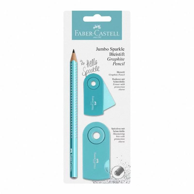 Zestaw Jumbo Sparkle Pearly&Sleeve (Ołówek+Temperówka+Gumka) Turkusowy Blister Faber-Castell