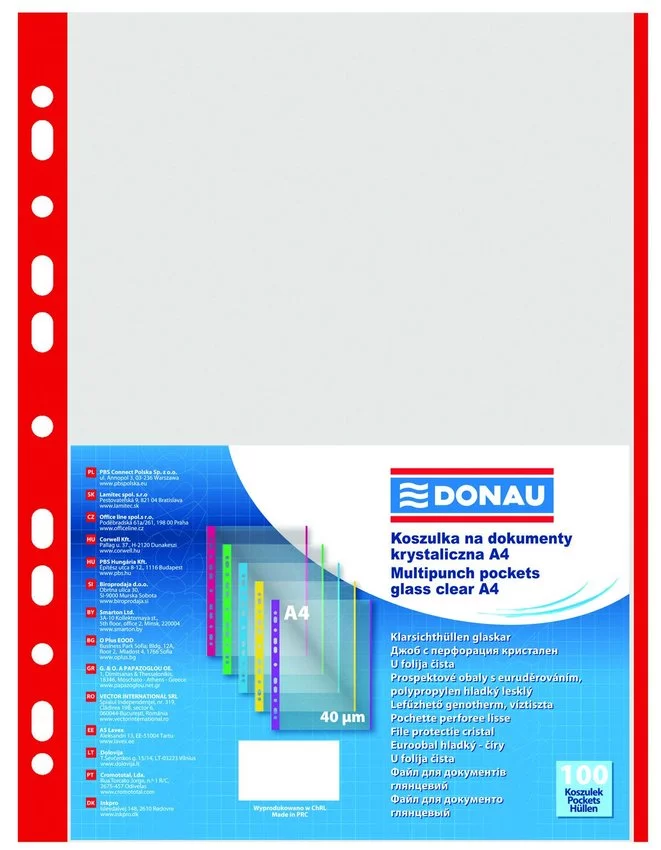 KOSZULKI NA DOKUMENTY DONAU, PP, A4, KRYSTAL, 40MIKR., KOLOROWY BRZEG - CZERWONY, 100SZT.
