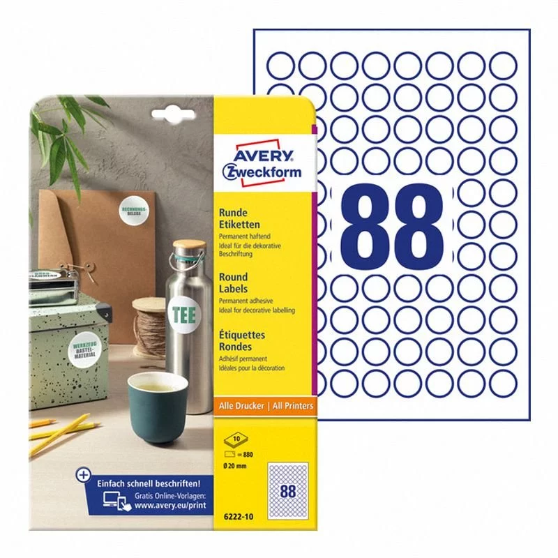 Etykiety Samop. Avery Okrągłe śr. 20mm 88/A4 Trwałe Białe No.6222-10