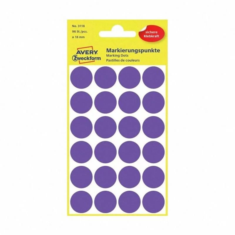 Samoprzylepne kółka do zaznaczania Avery Zweckform 3118 w modnym fioletowym kolorze są idealne do oznaczania, klasyfikowania porządkowania, planowania i tworzenia harmonogramów.