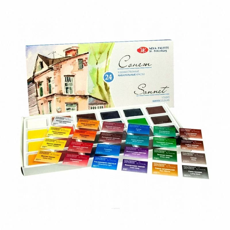 Akwarele studyjne z serii „Sonnet” wykonane są z wysokiej jakości pigmentów i spoiw. Cechą charakterystyczną tych farb jest intensywność tonacji, która jest zachowana nawet przy dużym rozcieńczeniu. Każdy kto kiedykolwiek używał tych farb doskonale wie iż farby te świetnie się mieszają, rozmywają i rozprowadzają. Polecane są do pracy w procesie edukacji artystycznej (w tym zawodowej).