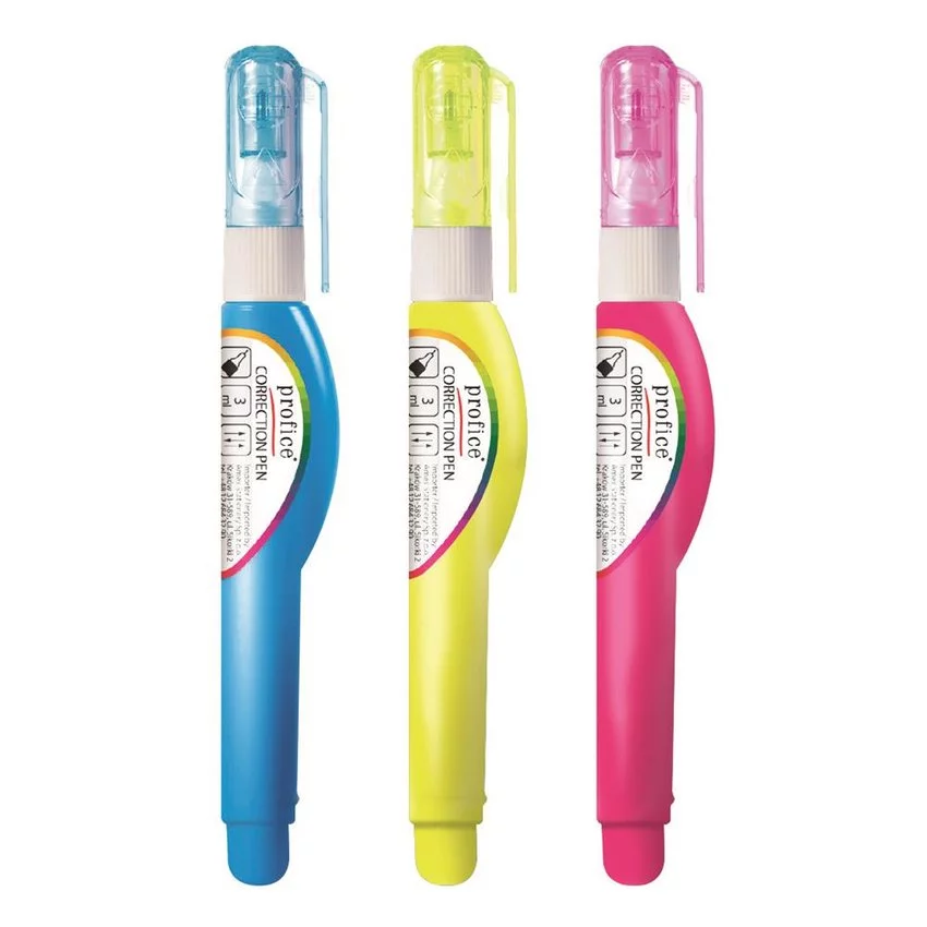 Korektor w pisaku o pojemności 3 ml. Posiada metalową, precyzyjną końcówkę do dokładnej aplikacji substancji korygującej. Korektor dostępny w mixie trzech neonowych kolorów obudowy. Kolory wysyłane losowo !
