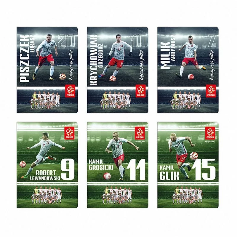 Zeszyt z motywem piłkarzy kadry narodowej. Zeszyt w laminowanej okładce, z marginesem. Okładka z zadrukiem wewnętrznym. Okładka z metalicznymi elementami.
